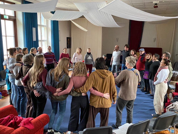 Oder Steffi aus Bremen: „Wenn ich hier in die Aula komme, merke ich, wie sehr ich mich verändert habe - in den vier Jahren, seitdem ich das erste Mal herkam. Damals hatte ich noch so viele Vorbehalte im Kopf und mein erster Schritt da raus, war hier“. Und ein weiterer Gast betont die Vielfältigkeit des ZEGG: „Wie das hier immer so zusammenfließt... Toll, dass auch die Kunst dazu kommt“.